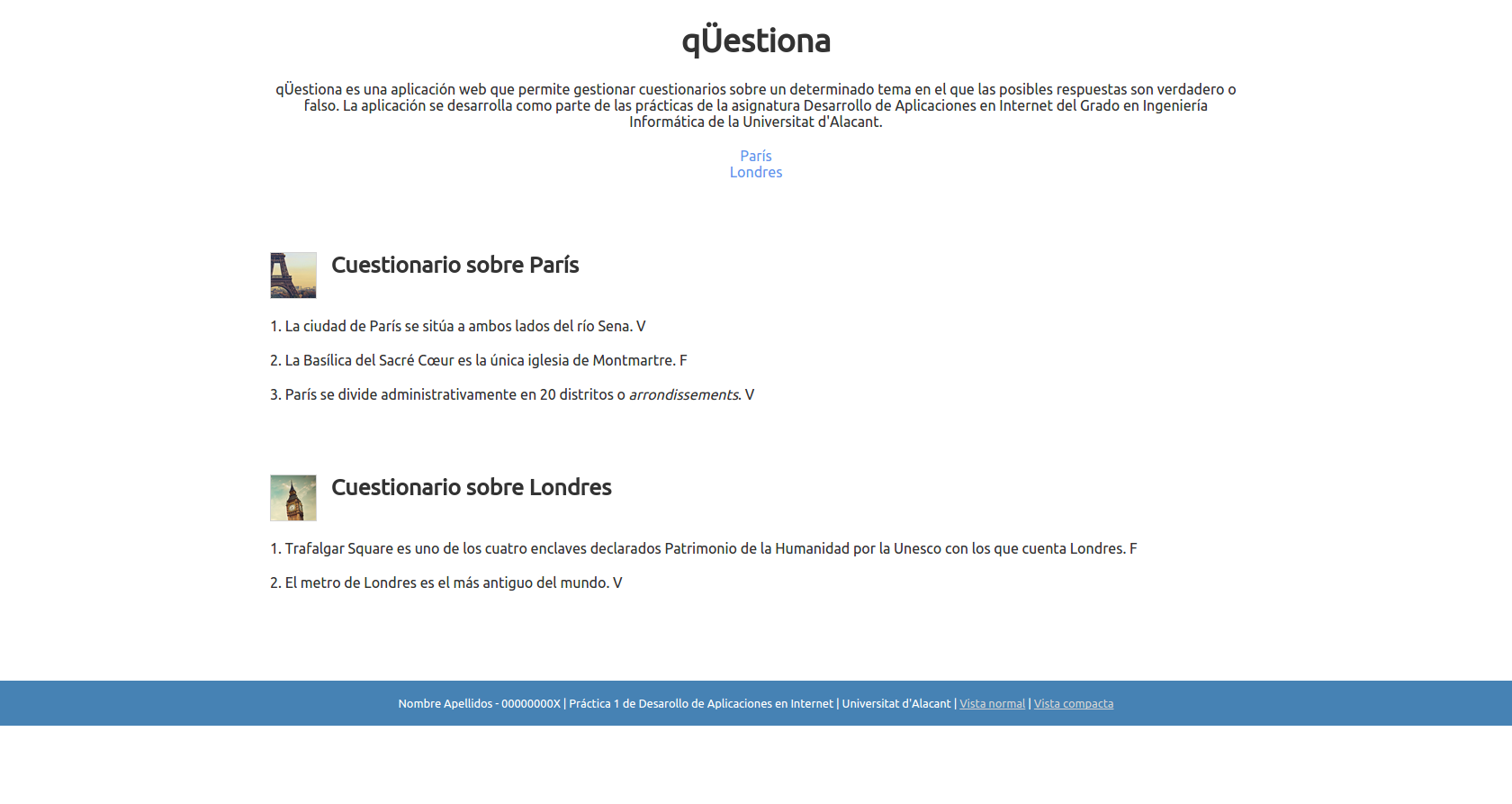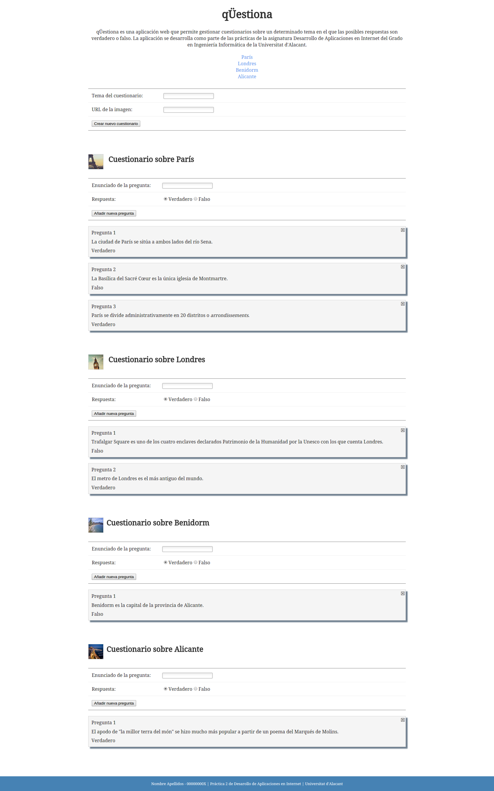 En esta práctica extenderás la práctica anterior con la incorporación de elementos dinámicos mediante JavaScript. En particular, será posible añadir y eliminar cuestionarios, así como añadir y eliminar sus preguntas; todo ello en el navegador, sin interaccionar con ningún servidor o base de datos. Para ello, la sección main del documento tendrá al principio un formulario que permitirá añadir nuevos cuestionarios indicando su título y su imagen asociada; además, al principio de cada cuestionario (tras el título e inmediatamente antes de la primera pregunta, si la hubiera) se mostrará otro formulario que permitirá añadir una nueva pregunta y su respuesta (verdadero o falso) al final del cuestionario correspondiente. Se permitirá, además, borrar individualmente las preguntas de los cuestionarios.